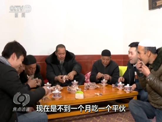 吃平伙是東鄉(xiāng)族老百姓的一個傳統(tǒng),就是大家買一只羊,平攤價格以后搭伙吃羊肉。過去,只有家里娶媳婦、蓋房子這樣的大事,才能吃個平伙?,F在生活好了,家里請客的時候也吃平伙,今天,馬麥志要請客,不用大家出份子錢了。他說大兒子在外面打工,自己在干清潔工,媳婦在車間里面炸油馃馃,收入應該有3萬多元。